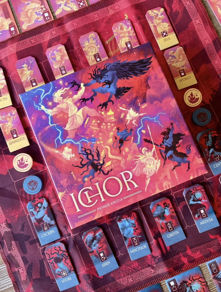 That said, Ichor isn’t quite as pure as some of Knizia’s other abstracts, including, for me, Iliad. The powers add texture and theme, which I like, but they also mean you’re reading your cards more, double-checking what’s available, trying to hold more in your head. It’s not hard, but it’s not pure minimalist either. And one more nitpick I would be remiss not to mention: the retail version standees fall over constantly. If I bothered to pull out my iron (I’m sure it’s somewhere…) for the cloth board, this issue would be solved but I don’t want to do choresssss.