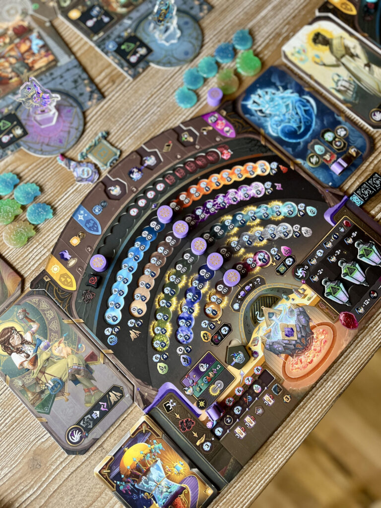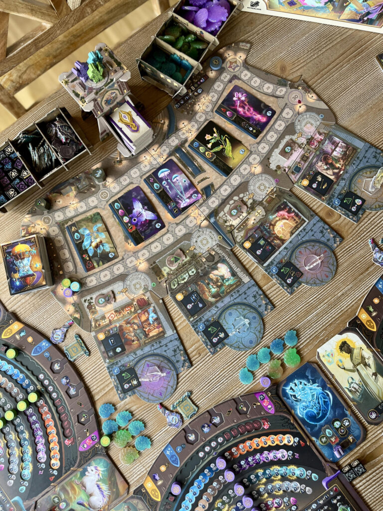 It helps that the whole thing looks and feels premium. I was sent a temporary copy of the Collector’s Edition, and the production value is stellar. The Glimmershells (the in-game currency) are chunky, glittery plastic which maybe doesn’t sound so great when described but feel surprisingly satisfying in hand. Triple-layered player boards keep all your moving pieces in place. The storage solution makes setup pretty painless. Add in the height and depth, color, and detailed artwork, and the table presence is undeniable. From what I understand, the Collector’s Edition is exclusive to Kickstarter, with a retail version coming later. I can’t speak to how that one will look, but the prototype Collector’s Edition is impressive.