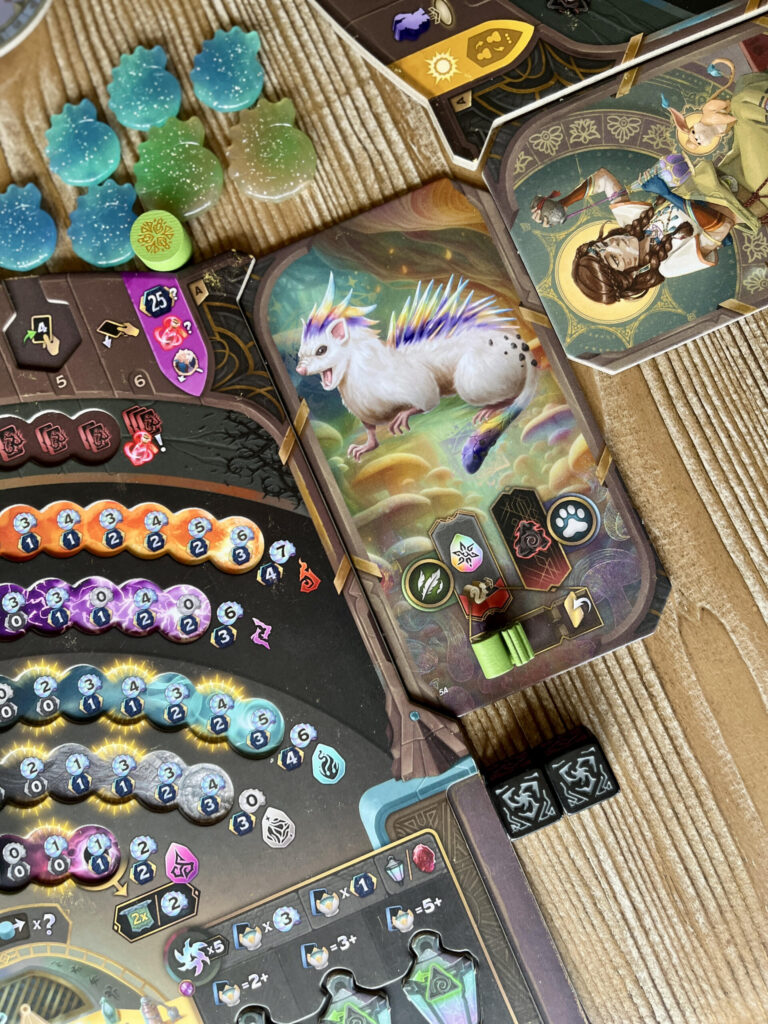 Replayability is a huge strength of the game. Shops and night actions can be flipped or rearranged, bonus tiles can be swapped for new effects, and while most character tiles feel similar (only two noticeably shift your playstyle), the arcana tiles, which are your pets, offer fun asymmetric bonuses. You can also flip the player boards over for asymmetric characters. I only played one and it basically had me hone in on a specific aspect of play. If I had the game for longer, I think I would actually be happy to play symmetrically for quite a while, because there’s so much there. Still, nice to have the option.