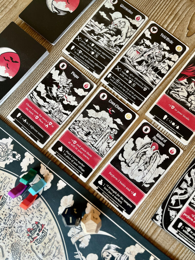 Every card feels powerful, but not unfair. Town Charter can convert a village into a Town…potentially your fifth and final necessary piece for victory, if you can hang on to it through the end of the round. Ritual of Ascension upgrades your Vampire Lord permanently. These moments feel huge, but never broken. The cards are powerful, but well balanced from what I can tell. No one has completely run away with a game because they gained one of these cards, partly because there are more waiting in the wings.